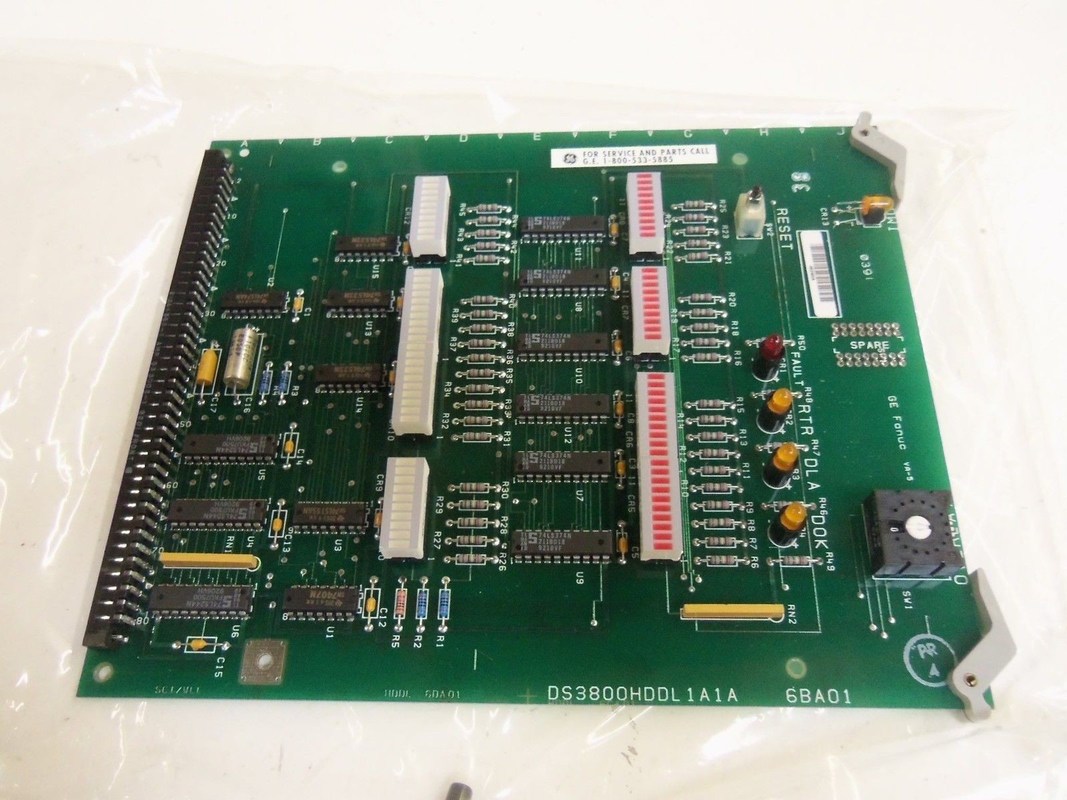 El DS3800HDDL es una interfaz HMI o hombre-máquina de General Electric. El DS3800HDDL tiene cuarenta y cinco resistencias azul claro con bandas rojas, púrpura, amarilla, negra y marrón.Hay cuatro resistencias que son azul claro y tienen una banda marrón tres bandas negras y luego otra banda marrónEl último resistor es de color azul claro con dos bandas marrones, dos bandas negras y una última banda marrón.Hay quince EPROM.Cada EPROM es un componente programable que contiene los datos para que la placa funcione correctamente.Esta sección está etiquetada como "SPARE" y tiene los puntos de conexión adecuadosEl DS3800HDDL también tiene un gran terminal de conexión femenina a lo largo del borde.El DS3800HDDL también tiene dos condensadores amarillos de diez puntas y dos condensadores de plataEsta placa también cuenta con cinco LED (diodos emisores de luz). Cuatro de los LED son de color amarillo y uno de color rojo. También hay seis tiras cada una con una pequeña sección que se ilumina.Cada luz en estas tiras tiene un número y una fase correspondientes para indicar lo que está pasando con la máquinaCada banda de luces está dividida en diferentes secciones: fallos del motor, fallos del convertidor, alarmas, estado de la unidad, selección de referencia y estado.También hay un pequeño botón de restablecimiento para presionar una vez que el problema ha sido resuelto.